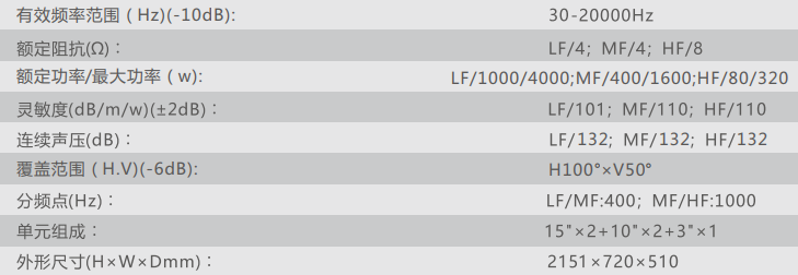 4.大动态、高功率的双15寸低音单元设计,保证各类电影院声场动态范围的要求。